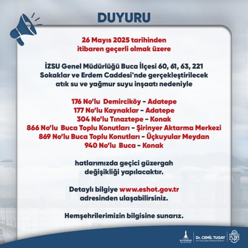 MEDYA EGE - İzmir Büyükşehir Belediyesi ESHOT Genel Müdürlüğü, İZSU Genel Müdürlüğü tarafından Buca İlçesi 60, 61, 63, 221 Sokaklar ve Erdem Caddesi'nde gerçekleştirilecek atık su ve yağmur suyu inşaatı nedeniyle bazı hatlarda güzergah değişikliğine gidildiğini duyurdu.