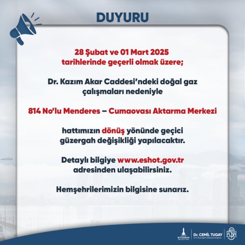 Dr. Kazım Akar Caddesi'ndeki doğal gaz çalışmaları nedeniyle 814 No'lu Menderes - Cumaovası Aktarma Merkezi hattımızın dönüş yönünde geçici güzergah değişikliği yapılacaktır.