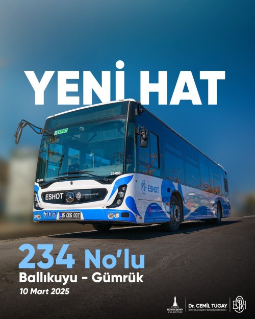 MEDYA EGE - ESHOT Genel Müdürlüğü İzmir genelinde otobüs ulaşımını kolaylaştırmak için çalışmalarına devam ediyor. Bu kapsamda ESHOT, 234 No'lu Ballıkuyu-Gümrük hattının 10 Mart (Bugün) itibariyle hizmete açıldığını duyurdu.