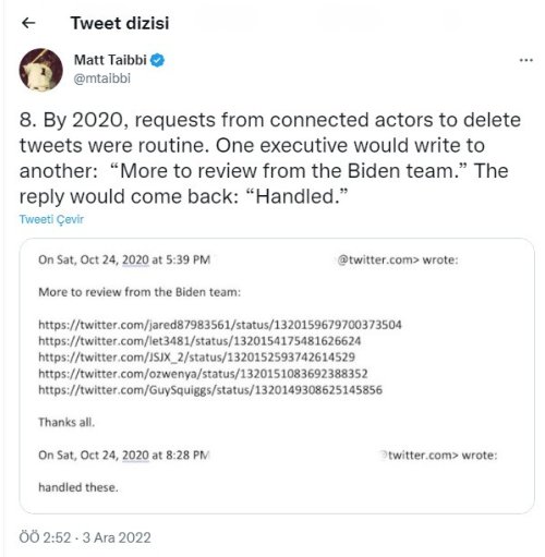 Bir e-mailin ekran görüntüsü paylaşan Taibbi, 2020'ye gelindiğinde siyasilerden ünlülere kadar birçok aktörün tweet'leri silme taleplerinin rutin hale geldiğini belirtti. Biden’ın ekibinin birçok paylaşım linkini, kaldırılması için şirkete ilettiğini aktaran Taibbi’nin paylaşımında çalışanlarından birinin "Biden’ın ekibinden incelenecek daha çok şey var” şeklinde e-mail attığı ve e-mailin "Ele alındı" şeklinde yanıtlandığı görüldü. Taibbi 2020'de hem Cumhuriyetçilerin hem de Demokratlardan talepler geldiğini vurgularken, talebine olumlu yanıt alanların daha çok Demokrat olduğunu işaret etti.