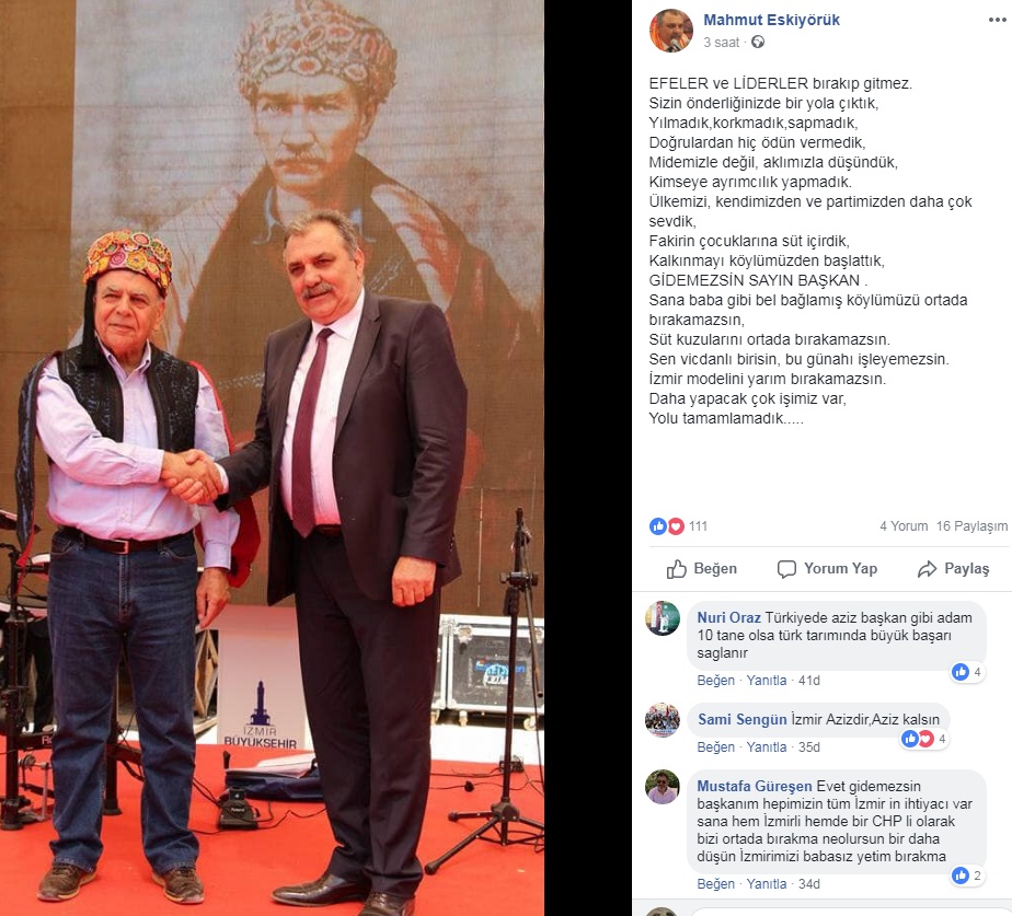 Yerel seçimlerde yeniden Büyükşehir Belediye Başkanı adayı olmayacağını açıklayan Aziz Kocaoğlu'nun bu kararı, İzmir'de gündem olmaya devam ediyor. Birlikte bir çok projede ortak imzaları bulunan Tire Süt Kooperatifi Başkanı Mahmut Eskiyörük de Başkan Kocaoğlu'na sosyal medya hesabından seslenerek, "Gidemezsin Başkan" dedi. Birlikte çekildikleri fotoğrafla birlikte duygusal bir yazı yazan Eskiyörük, açıklamasında şu sözlere yer verdi: