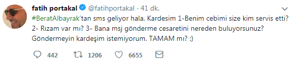Portakal, Twitter hesabından şu mesajı paylaştı: “Berat Albayrak’tan SMS geliyor hala. Kardesim 1-Benim cebimi size kim servis etti? 2- Rızam var mı? 3- Bana mesaj gönderme cesaretini nereden buluyorsunuz? Göndermeyin kardeşim istemiyorum. TAMAM mı?