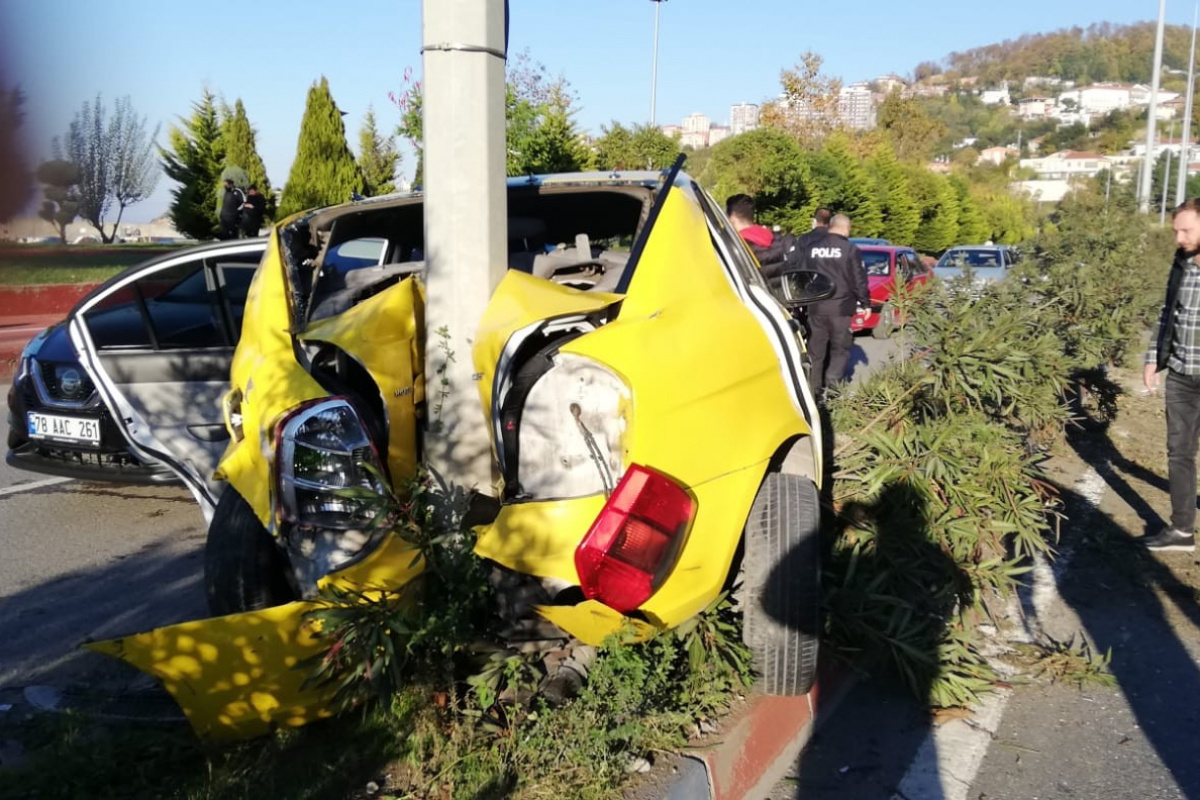 Kontrolden çıkan ticari taksi, aydınlatma direğine çarparak durabildi. Araç adeta kağıt gibi katlandı.