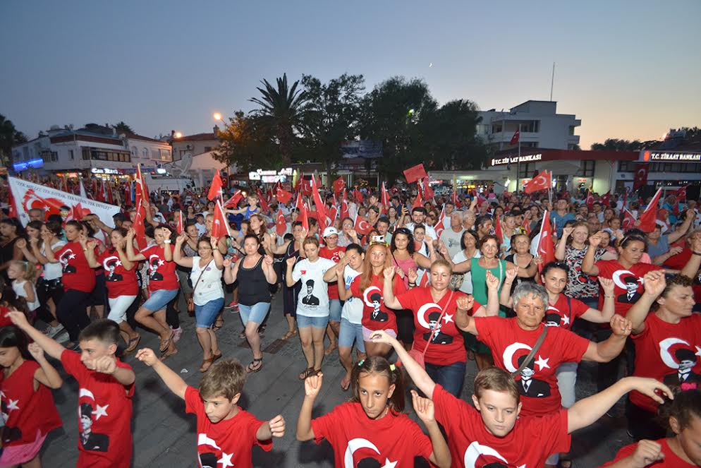Coşkulu kalabalık, darbeye karşı direnişin bir sembolü olarak, hep birlikte ‘zeybek’ oynadı.