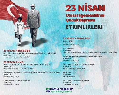 23 Nisan Ulusal Egemenlik ve Çocuk Bayramı dolayısı ile Foça’da üç günü kapsayan etkinlikler düzenlenecek.