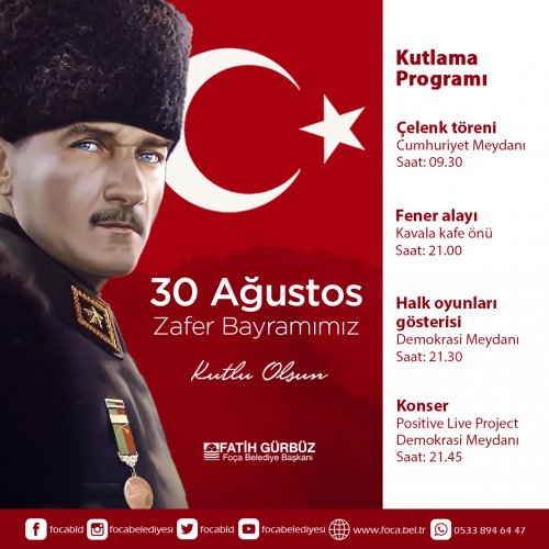 Foça’daki 30 Ağustos Zafer Bayramı kutlamaları, saat 09.30’da Cumhuriyet Meydanındaki çelenk sunma töreniyle başlayacak. Saat 21.00’de Kavala Kafeden başlayacak Fener Alayı, Demokrasi Meydanına ulaşacak.