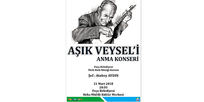 21 Mart 2018 Çarşamba günü, Foça Belediyesi Reha Midilli Kültür Merkezi’nde, saat 20.00’de başlayacak konserde, eserleriyle gönüllere taht kuran ünlü halk ozanı Aşık Veysel’in ölümünün 45. Yılı anılacak.