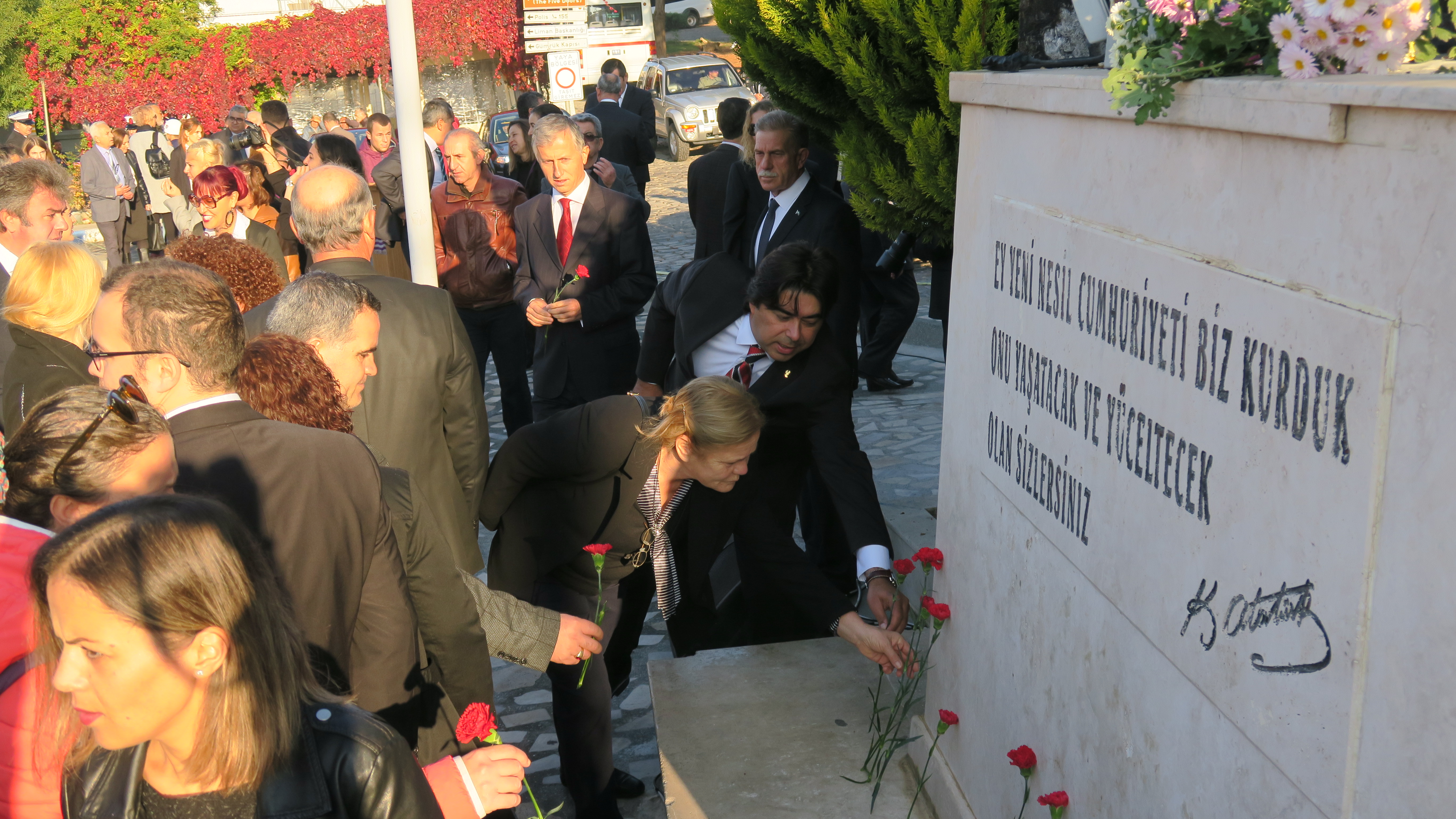 Saat 08.45’de başlayan çelenk sunma töreninde, Cumhuriyet Meydanı’nda Atatürk Anıtı’na, Foça Kaymakamlığı, Foça Garnizon Komutanlığı, Foça Belediye Başkanlığı, Atatürkçü Düşünce Derneği Foça Şubesi ve Türk Kadınlar Birliği Foça Şubesi çelenkleri sunuldu. Atatürk’ün manevi huzurunda iki dakikalık saygı duruşu, siren sesiyle birlikte saat 9’u 5 geçe başladı. Sirenin bitişinin ardından, İstiklal Marşı’mız tüm katılımcılar tarafından söylendi. Şanlı bayrağımız göndere çekildi ve sonra yarıya indirildi.