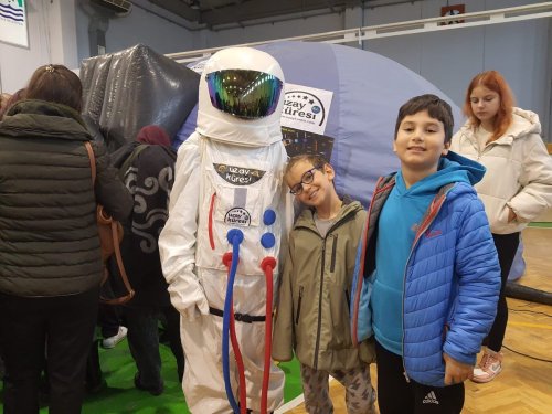 Astronot kıyafetli öğreticilerin karşıladığı çocuklar, uzay küresinin içinde yansıtılan gezegenlerin, yıldızların ve diğer gök cisimlerinin görüntülerini büyük hayranlıkla izledi.