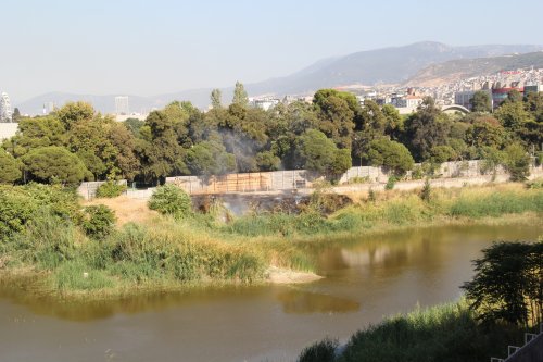 Konak ilçesinde bulunan Basmane Çukuru'ndaki otluk alanda yangın çıktı.