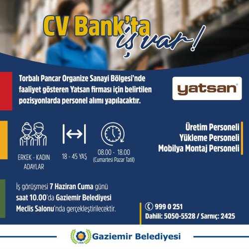 Gaziemir Belediyesi, belediyenin CV Bank Birimi aracılığıyla Torbalı'daki Pancar Organize Sanayi Bölgesi’nde faaliyet gösteren Yatsan firmasının personel alımı yapacağını duyurdu.