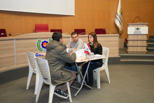 Forklift operatörü ve yetiştirilmek üzere üretim operatörü olarak çalışmak isteyen vatandaşların katıldığı toplu iş görüşmesi, Gaziemir Belediyesi Meclis Salonu'nda yapıldı.