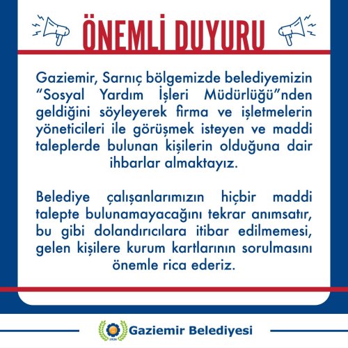 Belediye tarafından yapılan açıklamada şu ifadelere yer verildi; “Gaziemir, Sarnıç bölgemizde belediyemizin ‘Sosyal Yardım İşleri Müdürlüğü’nden geldiğini söyleyerek firma ve işletmelerin yöneticileri ile görüşmek isteyen ve maddi taleplerde bulunan kişilerin olduğuna dair ihbarlar almaktayız. Belediye çalışanlarımızın hiçbir maddi talepte bulunmayacağını tekrar anımsatır, bu gibi dolandırıcılara itibar edilmemesi, gelen kişilere kurum kartlarının sorulmasını önemle rica ederiz.”