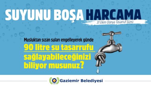 Gaziemir Belediyesi, 31 Ekim Dünya Tasarruf Günü’nde hazırladığı görsel çalışmalarla su tasarrufuna dikkat çekti. Belediye, yaptığı farkındalık kampanyasıyla “Suyunu boşa harcama” mesajı verdi.
