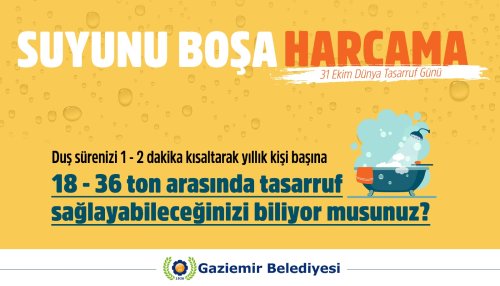 Meteoroloji Genel Müdürlüğü ve NASA’nın yayınladığı haritalar, Türkiye’nin karşı karşıya olduğu kuraklık sorununu gözler önüne seriyor. Doğal Hayatı Koruma Vakfı’na göre Türkiye'de aralarında İzmir’in de olduğu toplam 10 kent, küresel ölçekte yüksek susuzluk riski ile karşı karşıya. Gaziemir Belediyesi, yurttaşların dikkatini bu soruna çekmek için farkındalık çalışmaları yapmaya devam ediyor. Daha önce yaptığı çalışmayla barajların doluluk oranlarına, 22 Nisan Dünya Su Günü’nde hazırladığı görsel çalışmayla yiyecek, içecek, ayakkabı ve giysi ürünlerinin üretim sürecinde harcanan su miktarına dikkat çeken belediye, 31 Ekim Dünya Tasarruf Günü’nde de özel bir farkındalık projesine imza attı. Belediye, hazırladığı görsellerle her bireyin alacağı küçük önlemlerle yapacağı su tasarrufuna dikkat çekti.