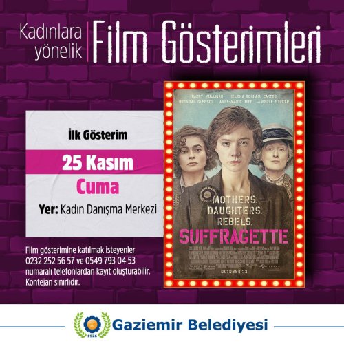 Feminist film kuşağından olan ve Birleşik Krallık'taki kadınların oy hakkı mücadelesini anlatan Suffragette (Diren) gösterimi gerçekleştirecek olan Belediye, film sonrasında kadınları kadın hakları üzerine gerçekleştirilecek söyleşiye davet etti.