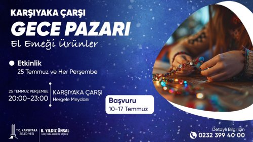 Karşıyaka Belediyesi, kentin en büyük açık hava alışveriş merkezlerinden biri olan Karşıyaka Çarşısı’nda ‘Gece Pazarı’ düzenlemeye başlıyor. Vapur İskelesi karşısındaki Hergele Meydanı’nda kurulacak pazarda Karşıyakalı üreticiler tarafından takı, dekoratif obje, çanta ve giysi gibi çeşitli el emeği ürünler satışa sunulacak. Stant tahsisi için 10 Temmuz’da açılan başvurular, 17 Temmuz’da sona erecek. Başvuruların tamamlanmasının ardından çekilecek kurayla pazarda yer alacak satıcılar belirlenecek. İlki 25 Temmuz’da 20.00-23.00 saatleri arasında kurulacak olan Gece Pazarı, yaz boyunca her perşembe günü halkla buluşmaya devam edecek. Organizasyon ve stant başvurularına ilişkin 0232 399 40 00 numaralı telefondan detaylı bilgi alınabilecek.