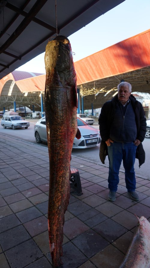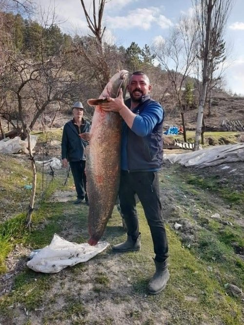 "Bu balık 2 metrenin üzerinde ve tam 52 kilogram ağırlığında. Bu zamana kadar yakaladığım en büyük balık. Haftada 2-3 tane yayın balığı yakalıyoruz ve bu yıl baraj oldukça bereketli. Hedefim 100 kilogramlık bir balık yakalamak."