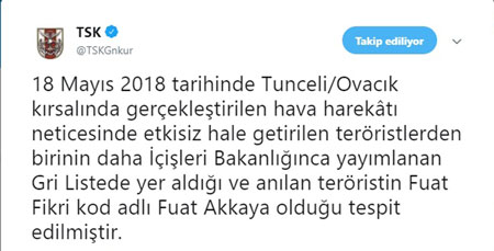 TSK'nın sosyal paylaşım sitesi Twitter üzerinden yapılan paylaşımda, "18 Mayıs 2018 tarihinde Tunceli/Ovacık kırsalında gerçekleştirilen hava harekatı neticesinde etkisiz hale getirilen teröristlerden birinin daha İçişleri Bakanlığınca yayımlanan gri listede yer aldığı ve anılan teröristin Fuat Fikri kod adlı Fuat Akkaya olduğu tespit edilmiştir" denildi.