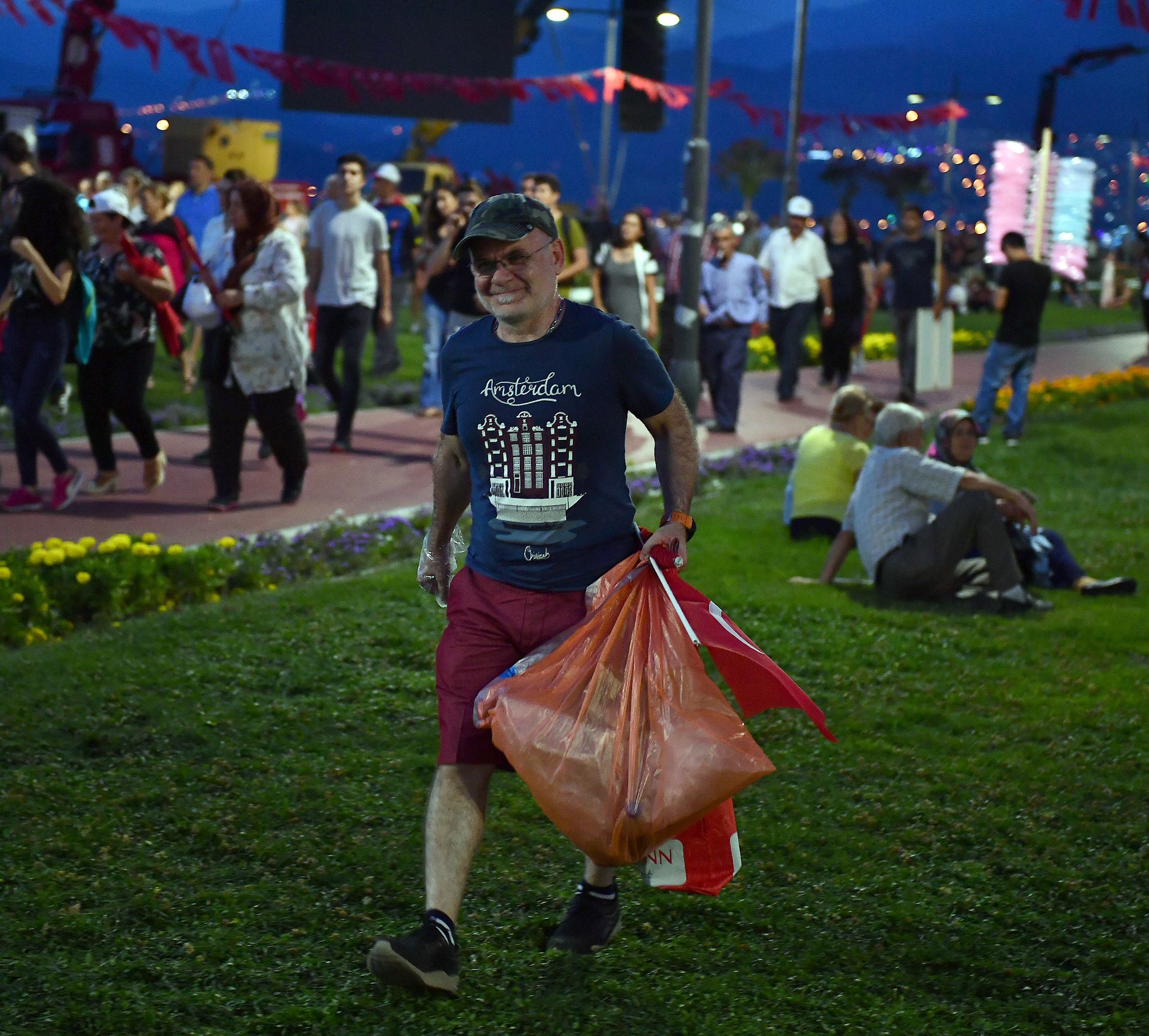 İzmir Büyükşehir Belediyesi ekiplerinin temizlik çalışması öncesinde, alanda dağıtılan ya da yanlarında getirdikleri çöp torbalarıyla "mıntıka temizliğine" girişen her yaştan İzmirli, her dönemde çağdaşlığın kenti olan İzmir'in farkını bir kez daha göstererek adeta herkese "medeniyet dersi" verdi.