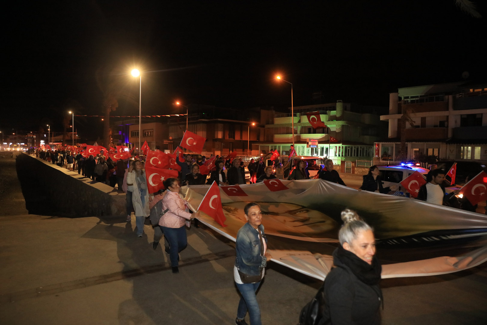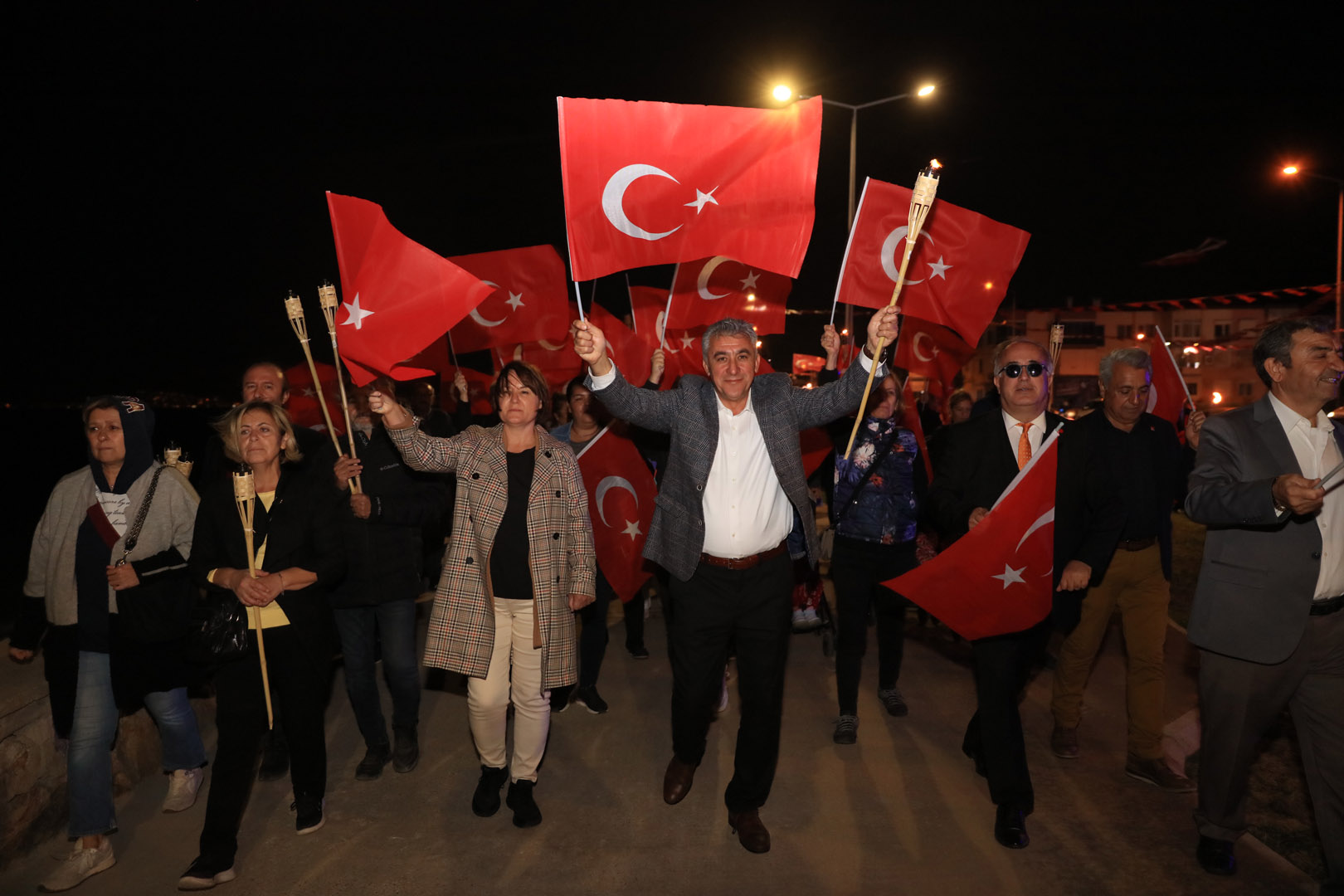 Güzelbahçe Maltepe Mahallesi Tabaoğlu Parkı’nda toplanan Cumhuriyet sevdalısı yüzlerce Güzelbahçeli, ellerinde meşalelerle yaklaşık iki kilometre sahil boyunca yürüdü. Ege Sistem Okulları Bando takımının çaldığı marşlar eşliğinde yürüyen ve sık sık “Yaşasın Cumhuriyet”, “Cumhuriyet Fazilettir” “Mustafa Kemalin Askerleriyiz” sloganı atan Güzelbahçeliler, Güzelbahçe Atatürk Kültür Merkezi önünde yürüyüşlerini tamamladı.