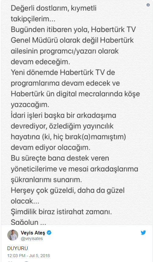 "Değerli dostlarım, kıymetli takipçilerim... Bugünden itibaren yola, Habertürk TV Genel Müdürü olarak değil Habertürk ailesinin programcı/yazarı olarak devam edeceğim. Yeni dönemde Habertürk TV de programlarıma devam edecek ve Habertürk ün digital mecralarında köşe yazacağım. idari işleri başka bir arkadaşıma devrediyor, özlediğim yayıncılık hayatına (ki, hiç bırak(a)mamıştım) devam ediyor olacağım. Bu süreçte bana destek veren yöneticilerime ve mesai arkadaşlarıma şükranlarımı sunarım. Her şey çok güzeldi, daha da güzel olacak... Şimdilik biraz istirahat zamanı. Sağolun."