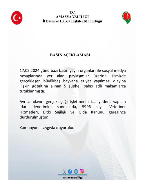 Amasya Valiliğinden yapılan açıklamada, "Olayın gerçekleştirildiği işletmenin faaliyetleri yapılan idari denetimler sonrasında 5996 sayılı veteriner hizmetleri, bitki sağlığı ve gıda kanunu gereğince durdurulmuştur” açıklamasında bulundu.