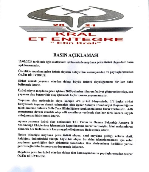 Olayın yaşandığı Kral Et Entegre tesisi işletmesi de açıklama yaptı. Açıklamada, “İdari makamlarca verilecek her türlü karara saygılı olduğumuzu ifade etmek isteriz. Meydana gelen bu üzücü olaydan dolayı tüm kamuoyundan ve paydaşlarımızdan tekrar özür diliyoruz” ifadelerine yer verildi.