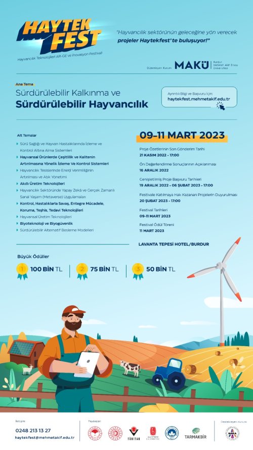 YÖK Bölgesel Kalkınma Odaklı Misyon Farklılaşması ve İhtisaslaşma Programı kapsamında 2017 yılından bu yana "Hayvancılık" alanında gelişim ve yenilik odaklı projeler yürüten Mehmet Akif Ersoy Üniversitesi, bu projelerden elde edilen somut çıktıları kamuoyuyla paylaşmak ve sektörün sorunlarına çözüm oluşturabilecek fikirleri bir araya getirebilmek adına 09-11 Mart 2023 tarihleri arasında Hayvancılık Teknolojileri AR-GE ve İnovasyon Festivali (HAYTEKFEST) düzenleyecek. Mehmet Akif Ersoy Üniversitesi ev sahipliğinde Sürdürülebilir Kalkınma ve Sürdürülebilir Hayvancılık ana temasıyla "Hayvancılık Teknolojileri AR-GE ve İnovasyon Festivali (HAYTEKFEST)" kapsamında HAYTEKFEST Proje Yarışması organize edilecek. Organizasyonda, ülke genelinde hayvancılık teknolojileri alanında araştırma yapan araştırmacılar, kamu ve özel sektör işletmeleri, yatırımcılar (projelere ortak olmak isteyen ve finansman sağlamak isteyen müteşebbisler), girişimciler ve öğrenciler bir araya gelecektir.