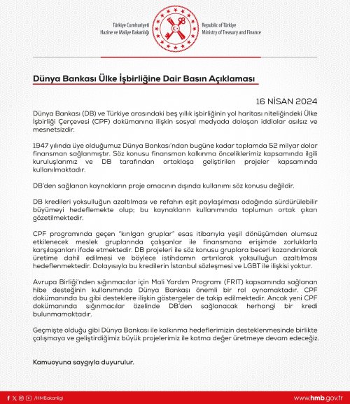 Hazine ve Maliye Bakanlığı, Dünya Bankası ve Türkiye arasındaki beş yıllık iş birliğinin yol haritası niteliğindeki Ülke İş birliği Çerçevesi dokümanına ilişkin sosyal medyada dolaşan iddialara ilişkin bir yazılı açıklama yaptı. Yapılan açıklamada, bu iddiaların asılsız ve mesnetsiz olduğunu belirtildi. Türkiye’nin 1947’de Dünya Bankasına üye olduğunun hatırlatıldığı açıklamada, "Dünya Bankasından bugüne kadar toplamda 52 milyar dolar finansman sağlanmıştır. Söz konusu finansman kalkınma önceliklerimiz kapsamında ilgili kuruluşlarımız ve DB tarafından ortaklaşa geliştirilen projeler kapsamında kullanılmaktadır" denildi.