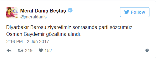 Baydemir’in gözaltına alındığını HDP Adana Milletvekili Meral Danış Beştaş Twitter hesabından duyurdu.