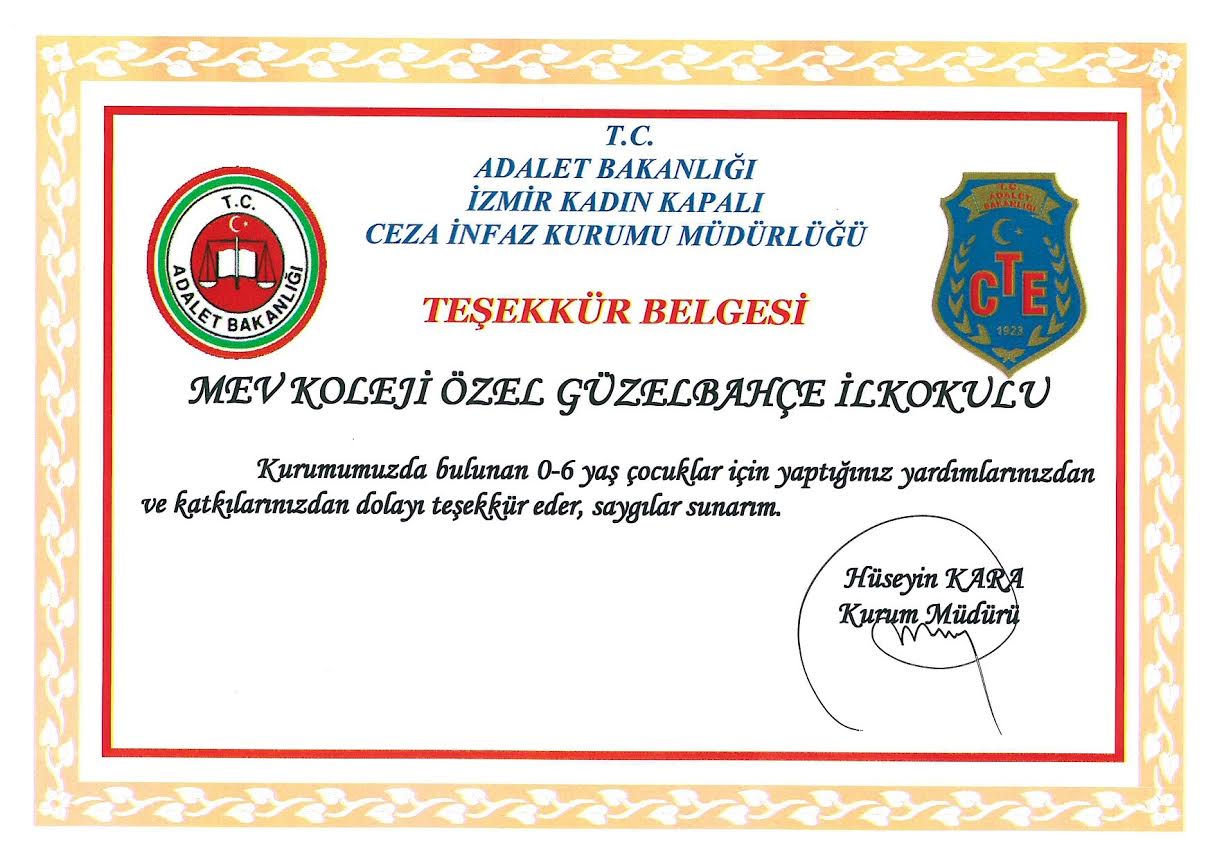İnfaz Kurumu Müdürü Hüseyin Kara, kurum bünyesindeki 0-6 yaş grubu çocuklara yönelik katkılarından dolayı MEV Koleji Özel Güzelbahçe İlkokulu'na "Teşekkür Belgesi" takdim etti".