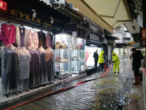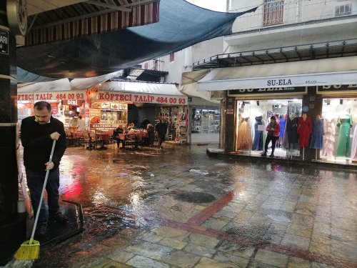 Sabah saatlerinde başlayıp öğlen saatlerinde etkisini artıran sağanak yağış, tarihi Kemeraltı Çarşısı’nda su baskınlarına sebep oldu.