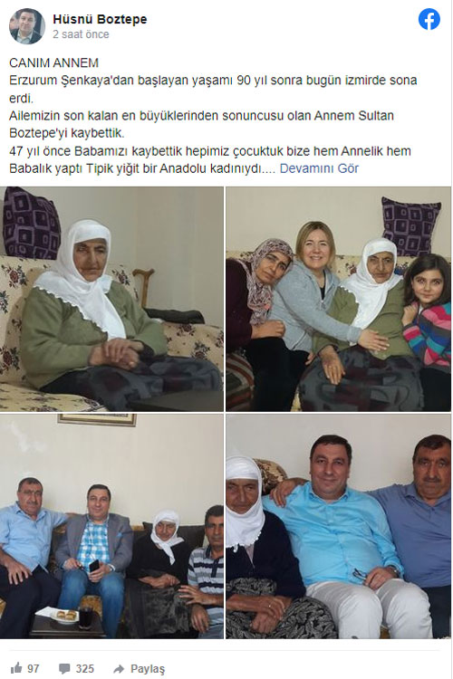 Acı haberi sosyal medya hesabından paylaşan İzmir Büyükşehir Belediyesi ve Çiğli Belediyesi AK Parti Meclis Üyesi Hüsnü Boztepe, 90 yaşındaki annesi Sultan Boztepe’nin hayata gözlerini yumduğunu ifade ederken cenazenin ise 28 Mayıs tarihinde (yarın) Yamanlar Muhammed Ali Camii’nde öğle namazına müteakip kılınacak cenaze namazı ardından Doğançay Mezarlığı’na defnedileceğini bildirdi.
