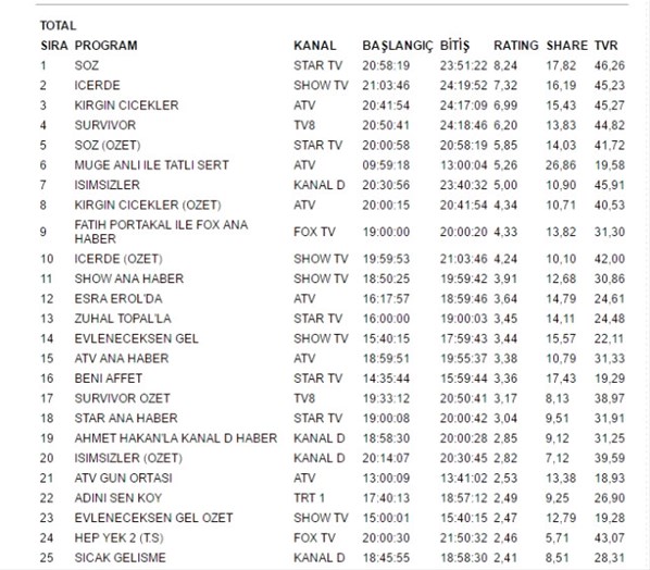 Star TV'de yayınlanan 'Söz' dizisi pazartesi gününün reyting birincisi oldu. Mayınlı tarlada anne ile çocuğun Türk askerleri tarafından kurtarılma sahnesini izleyici adeta nefesini tutarak izledi. Show TV'de yayınlanan 'İçerde' bu hafta 2. sırada yer aldı.