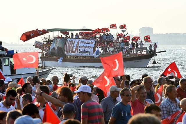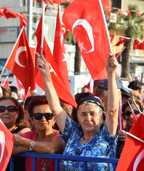 15 Temmuz Darbe Girişimi'nin ardından alanlara inen Cumhuriyet Halk Partisi'nin, İzmir Gündoğdu Meydanı'nda düzenlediği "Cumhuriyet ve Demokrasi' mitingine on binlerce İzmirli katıldı. Ellerindeki Türk bayraklarıyla meydanı dolduran katılımcılar, "Türkiye laiktir, laik kalacak", "Mustafa Kemal'in askerleriyiz" sloganları eşliğinde cumhuriyete ve demokrasiye olan bağlılıklarını dile getirdi. İzmir Büyükşehir Belediyesi ve ilçe belediyeler ile sivil toplum kuruluşları ve siyasi partilerin de destek verdiği mitingi Büyükşehir Belediye Başkanı Aziz Kocaoğlu, AKP İzmir İl Başkanı Bülent Delican'ın yanı sıra AKP ve CHP'li milletvekilleri ile birlikte izledi.