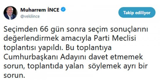 Muharrem İnce sosyal medyadan dile getirdiği tepkisinde, “Seçimden 66 gün sonra seçim sonuçlarını değerlendirmek amacıyla Parti Meclisi toplantısı yapıldı. Bu toplantıya Cumhurbaşkanı Adayını davet etmemek sorun, toplantıda yalan söylemek ayrı bir sorun” ifadelerini kullandı.
