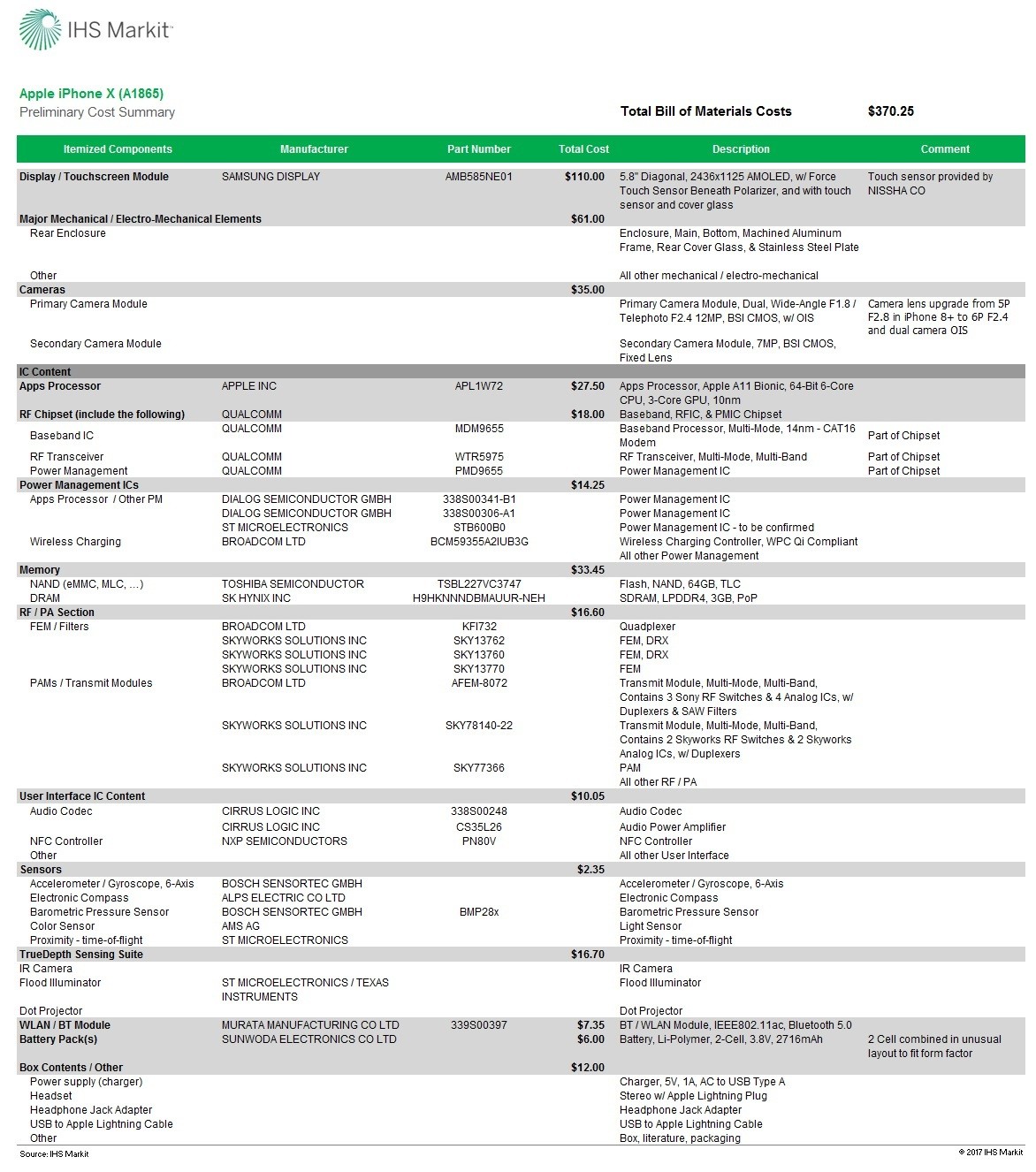 Genel olarak, iPhone X'in nihai maliyeti 370,25 dolar ve IHS'ye göre bu tahmin, TechInsights tarafından yapılana oldukça yakın ve cihaz için toplu parça satın alırken toplam 357,50 dolarlık toplam maliyeti gösteriyor .