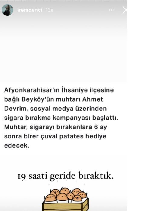 Sosyal medyadan sigarayı bırakma kampanyasını duyurarak destek veren ünlü şarkıcı İrem Derici’ye seslenen Muhtar Devrim, “İrem Derici’nin patatesi hazır, alması için köyümüze davet ediyoruz. Adres verirse adresine de ulaştırırız” diyerek kampanyaya katıldığı için kendisine teşekkür etti.