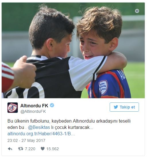 Altınordu Kulübü bu fotoğrafı paylaşarak yaptığı açıklamada, "Bu ülkenin futbolunu, kaybeden Altınordulu arkadaşını teselli eden bu Beşiktaşlı çocuk kurtaracak" ifadelerine yer verdi.