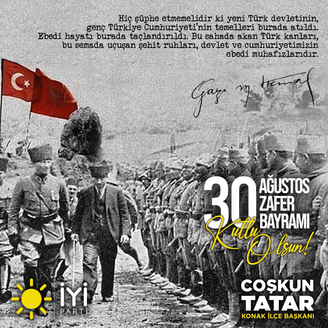 İYİ Parti Konak İlçe Teşkilatı, 30 Ağustos Zafer Bayramı’nın 100. yıl dönümü bir kutlama mesajı yayınladı.
