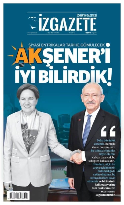 MEDYA EGE - İYİ Parti Genel Başkanı Meral Akşener'in Altılı Masadan ayrılmasından sonra İz Gazete 4 Mart’ta ‘Ak-Şener’i iyi bilirdik!’ manşetiyle çıktı.