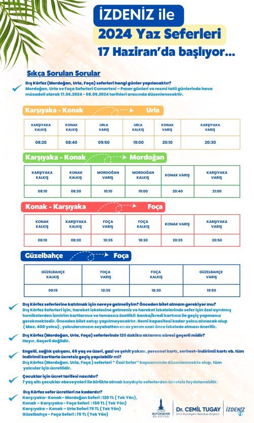 Bayramın ardından cumartesi ve pazar günleri, hava ve deniz müsaadeli olarak yapılacak yaz seferleri; Konak, Karşıyaka ve Güzelbahçe iskelelerinden Urla, Mordoğan ve Foça ilçelerine düzenlenecek. Önceki yıllarda tek iskeleden kalkan gemiler, bu yıl gidiş ve dönüşlerde hem Karşıyaka hem Konak iskelelerine uğrayacak.