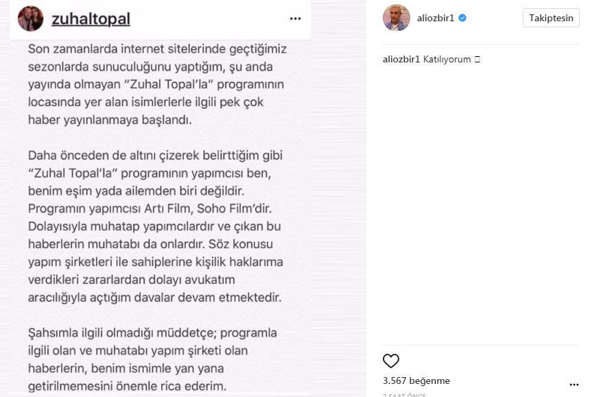 Son zamanlarda internet sitelerinde geçtiğimiz sezonlarda sunuculuğunu yaptığım, şu anda yayında olmayan 'Zuhal Topal'la ' programının locasında yer alan isimlerle ilgili pek çok haber yayınlanmaya başlandı. Daha önceden de altını çizerek belirttiğim gibi 'Zuhal Topal'la' programının yapımcı ben, benim eşim ya da ailemden biri değildir. Programın yapımcısı Artı Film ve Soho Film'dir. Dolayısıyla muhattap yapımcılardır ve çıkan bu haberlerin muhatabı da onlardır. Söz konusu yapım şirketleri ile sahiplerine kişilik haklarıma verdikleri zararlardan dolayı avukatım aracılığıyla açtığım davalar devam etmektedir.