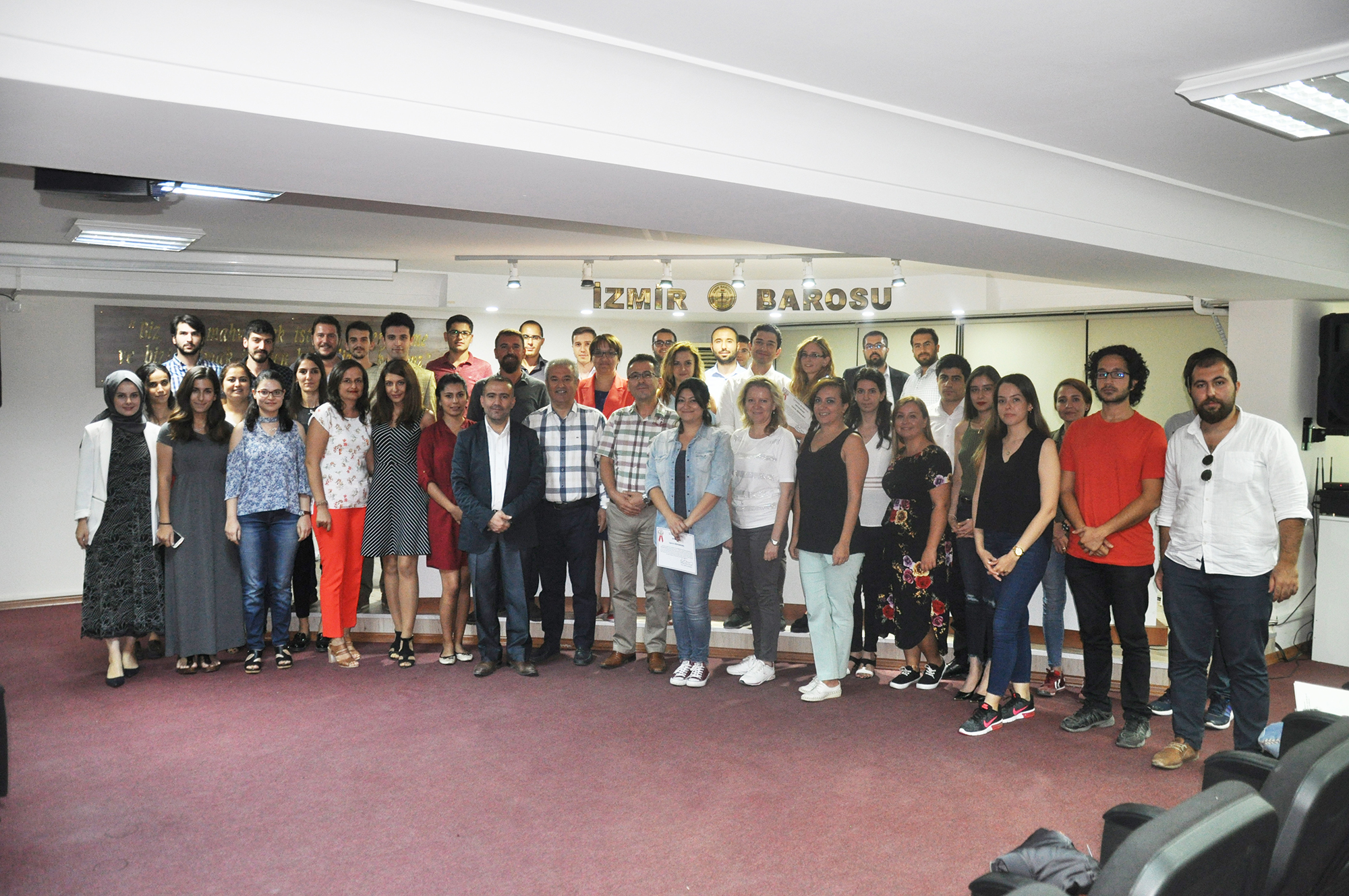 Her ay düzenli olarak yapılan ve üç gün boyunca yakalama ve gözaltı, tutuklama, hukuka aykırı deliller sorunu, ceza yargılamasında deliller, görüşmede temel ilkeler, soruşturma-kovuşturma evreleri arasındaki farklar, doğrudan soru, kovuşturma evresi, duruşma pratik çalışması ve CMK sistem tanıtımlarının yapıldığı eğitim çalışmasına katılan avukatlara katılım belgeleri yine İzmir Barosu Başkan Yardımcısı Av. Mustafa Çetin tarafından verildi.