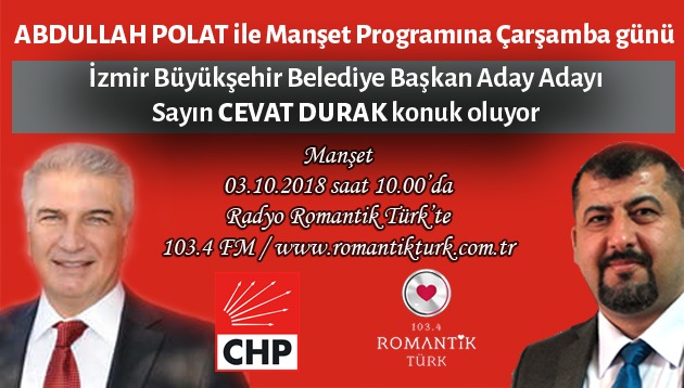 Karşıyaka eski belediye başkanı ve İzmir Büyükşehir Başkan aday adayı olan Cevat Durak, Radyo Romantik Türk'te Abdullah Polat'ın hazırlayıp sunduğu manşet programının canlı yayın konuğu olacak.