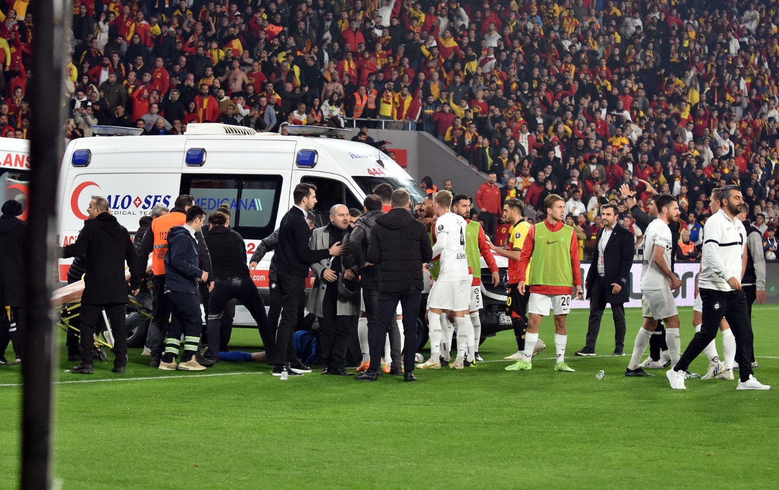 Altay tribünlerinden Göztepeli taraftarlara fişek atılmasının ardından Göztepe tribününde bazı taraftarlar feci şekilde yaralandı. Bunun üzerine sahaya 2 ambulans girerken maç durdu. Bu sırada sahaya inen bir Göztepe taraftarı ise korner bayrağı direğini alarak Altay kalecisi Ozan'a saldırdı. Ozan'a direkle darbeler indiren taraftar yaka paça gözaltına alındı. Aldığı darbeler sonrasında yaralanan Ozan yerde kalırken ambulansla hastaneye kaldırıldı. Güvenlik güçleri sahaya girerek olaylara müdahale etti.Futbolular ve hakemler soyunma odasına girdi.