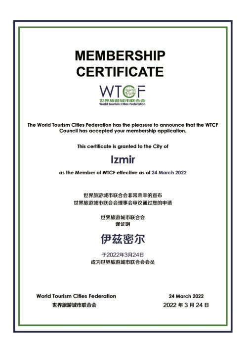 İzmir, Dünya Turizm Kentleri Federasyonu’na (World Tourism Cities Federation) üye oldu. Böylece İzmir, federasyona Türkiye’den kabul edilen ilk şehir olarak dünya turizm kentleri arasındaki yerini aldı. Federasyona turizm sektöründe öncü 223 kent üye. Üye kentler arasında Barcelona, Paris, Amsterdam, Dubai, Moskova ve Xiamen de yer alıyor.