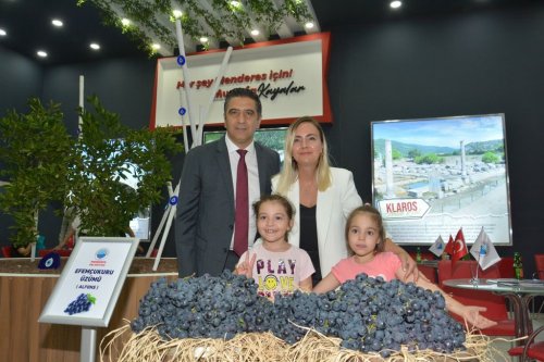 Başkan Kayalar, standı ziyaret eden konuklara, Menderes'in sembolü haline gelmiş tarım ürünlerinden biri olan ve çok özel üretim teknikleriyle geleneksel biçimde üretilen Efemçukuru (Alfons) üzümü ikram etti.
