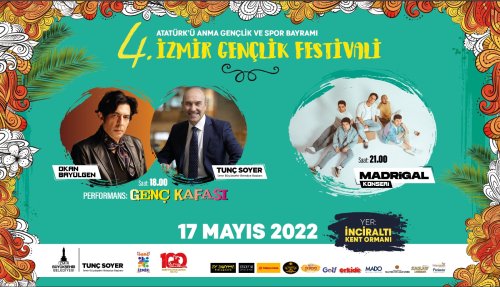 İzmir Büyükşehir Belediyesi, Milli Mücadele’nin 103’üncü yılının kutlanacağı 19 Mayıs Atatürk’ü Anma, Gençlik ve Spor Bayramı’nda Gençlik Festival’i düzenliyor. 17-21 Mayıs tarihleri arasında İnciraltı Kent Ormanı’ndaki festivalin ilk gününde saat 17.00’de İzmir Büyükşehir Belediye Başkanı Tunç Soyer, gençlik projelerini anlatacağı ve yeni projelerinin müjdesini vereceği bir tanıtım toplantısına ev sahipliği yapacak. Toplantının ardından 18.00’de ise Başkan Tunç Soyer, ünlü televizyoncu Okan Bayülgen’le gençlik buluşmasına katılacak. Kampın ilk gününde program 21.00’de Madrigal konseriyle devam edecek. Beş gün sürecek festival kapsamında 19 Mayıs 20.00’de ise Gündoğdu Meydanı’nda Teoman sahne alacak.